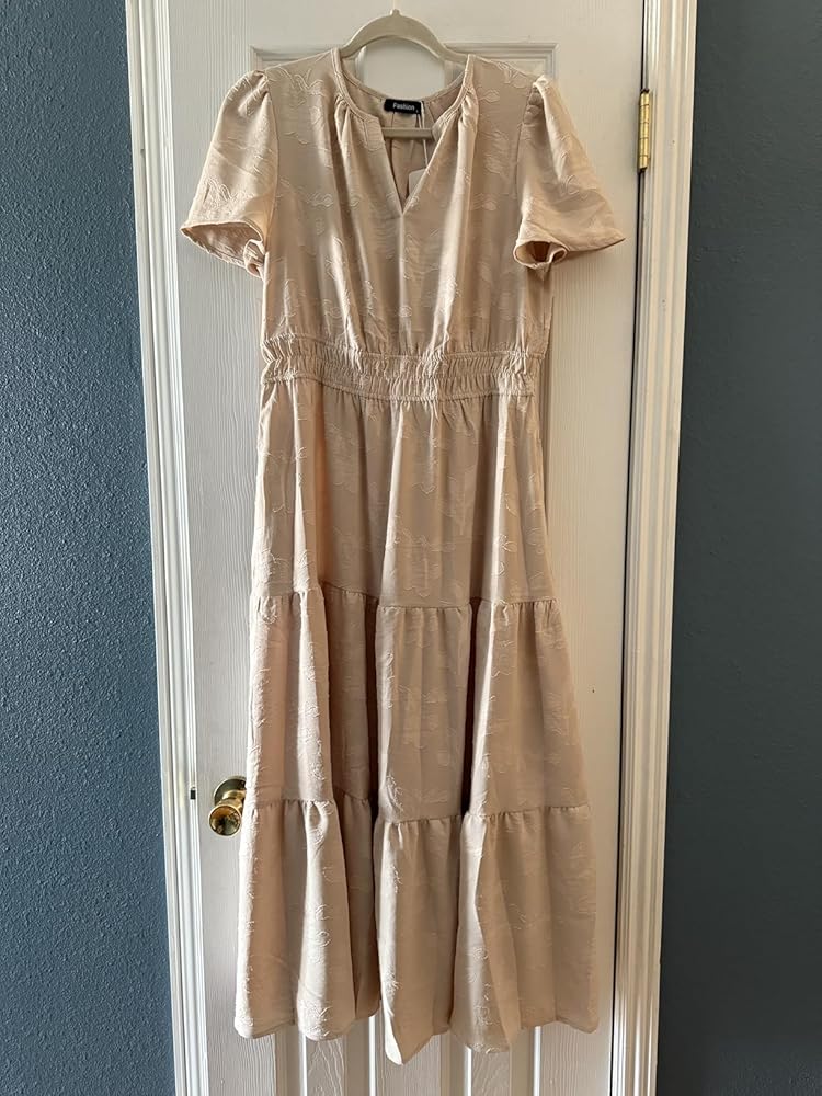 • 【Merkmale】Das sommerliche Strandurlaubs-Maxikleid fĂŒr Damen zeichnet sich durch flatternde kurze Ärmel, einen V-Ausschnitt, eine hohe Taille mit TaillengĂŒrtel, 2 Seitentaschen, eine figurbetonte Passform, eine einfarbige Gestaltung, einen gestuften RĂŒschensaum und eine A-Linien-Silhouette aus, die dieses lange Kleid schick und trendig machen.